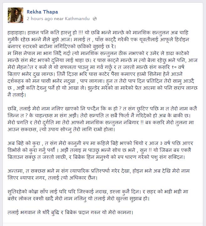 हेर्नुहोस रेखा थापा को फेसबुक पोस्ट स्क्रिन शट