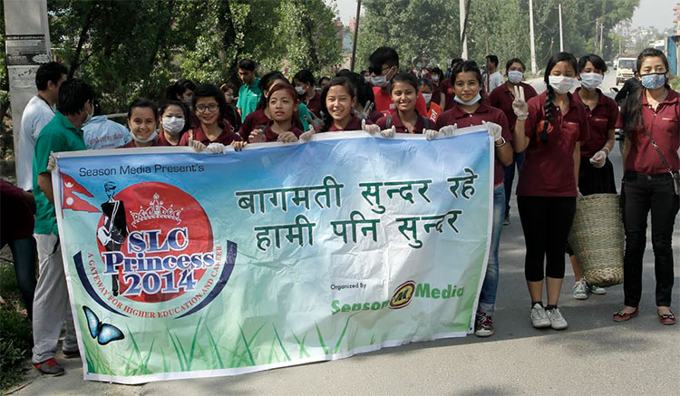 ग्ल्यामर नेपाल, काठमाडौं। सिजन मिडियाले राजधानीमा आयोजना गर्न लागेको चौथो संस्करणको ‘एसएलसी प्रिन्सेस २०१४’का प्रतिष्पर्धी ५२ जना सुन्दरीले शनिबार बिहान राजधानीको सिनामंगलस्थित भत्केको पुल मुनिको बाग्मती नदी सफाई गरेका छन्। बाग्मती सफाई अभियानको ५२ औं हप्ता पुगेको अवसरमा उनीहरुले बिहान सात बजेदेखि १० बजेसम्म नदी सफाई अभियानमा सहभागिता जनाएका हुन्।