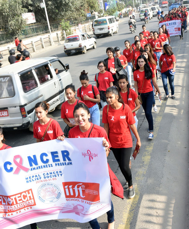 एयर होस्टेस र फेसन डिजाइनरका विद्यार्थीहरुलाई फ्लाईटेक इन्टरनेशनल एयर होस्टेस एकेडेमी, फेसन इन्स्टिच्युट आईआईएफटी र नेपाल क्यान्सर रिलिफ सोसाइटीले क्यान्सर सचेतनाका लागि सडकमा उतारेको हो।