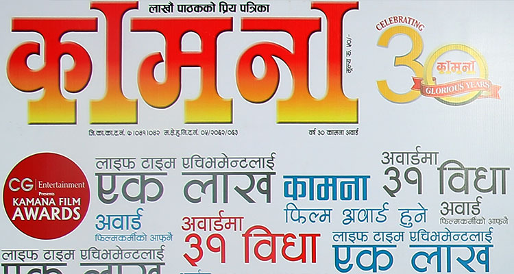 ग्ल्यामर नेपाल, काठमाडौं । चर्चित फिल्मी पत्रिका कामना मासिकले प्रकाशनको तीस वर्षको मौका पारी सिजी इन्टरटेनमेन्टसँगको सहकार्यमा यस वर्षबाट आयोजना गर्न लागेको ‘कामना फिल्म अवार्ड्स’का लागि आवेदन खुला गरेको छ। आयोजक कामना मासिकले अवार्डमा सहभागी हुनका लागि २०७० साल वैशाख १ गतेदेखि चैत्र मसान्तसम्म प्रदर्शित नेपाली फिल्मलाई आवेदन गर्न आव्हान गरेको हो।