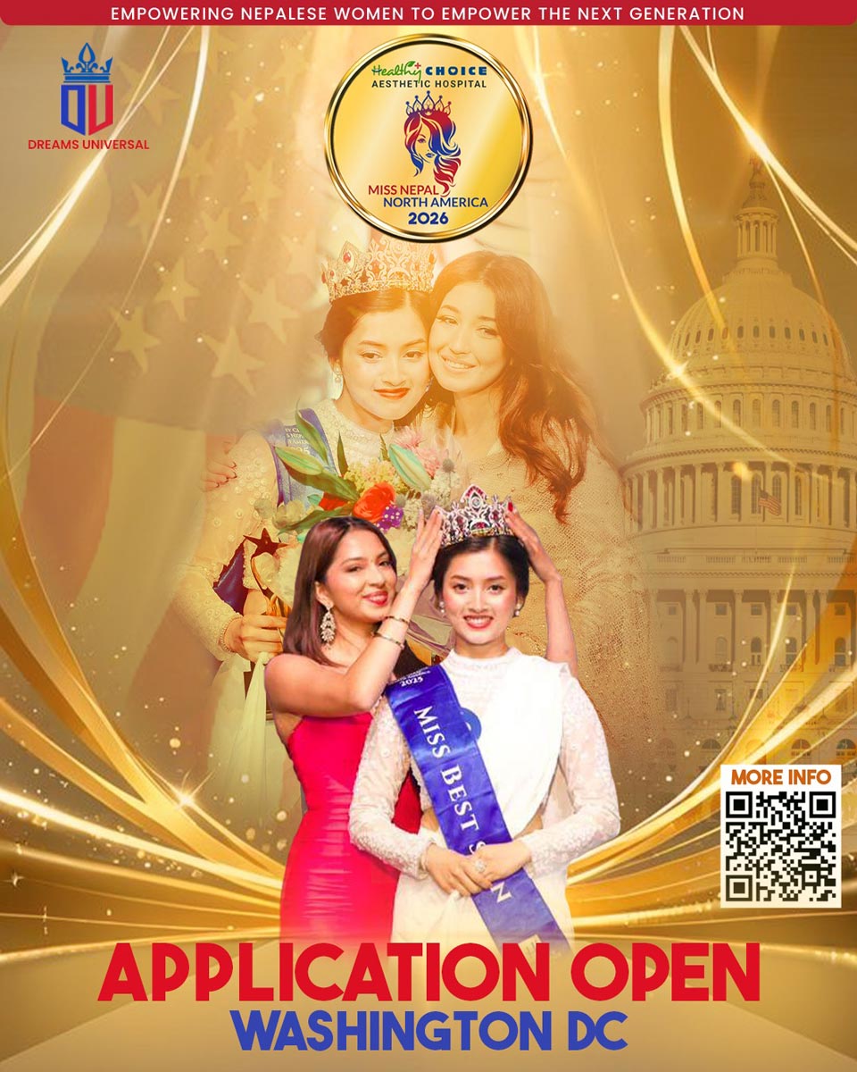 ‘मिस नेपाल नर्थ अमेरिका २०२६’को आवेदन खुला गरिएको छ। यस वर्षको ग्राण्ड फिनाले जुलाई २५ मा वासिङ्टन डी.सी.मा हुने भएको छ।