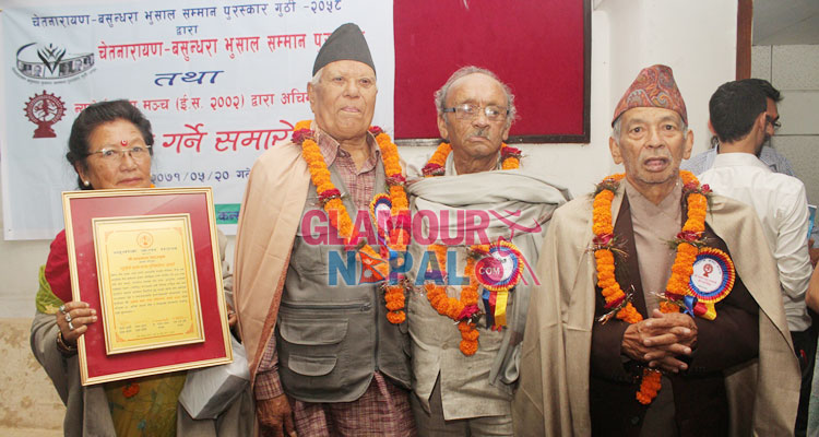 ग्ल्यामर नेपाल, काठमाडौं । चेतनारायण–बसुन्धरा भुषाल सम्मान पुरस्कार गुठीले शुक्रबार राजधानीमा विभिन्न कलाकारलाई सम्मान पुरस्कार प्रदान गरेको छ । गुठीले ‘चेतनारायण बसुन्धरा भुसाल सम्मान पुरस्कार २०६९’बाट वरिष्ठ शास्त्रीय संगीतज्ञ गोपालनाथ योगी, ‘चेतनारायण बसुन्धरा भुसाल सम्मान २०७०’बाट वरिष्ठ कलाकार सेनानी भीमबहादुर थापालाई सम्मान पुरस्कार प्रदान गरेको हो ।