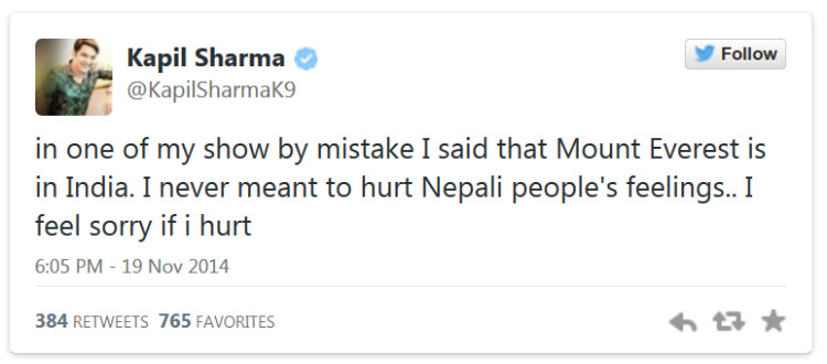 नेपाल आउने तयारीमा रहेका भारत सहित नेपालमा समेत लोकप्रिय टीभी शो कमेडी नाइट्स विथ कपिलका होस्ट कपिल शर्माले नेपालीहरु सँग ट्वीटर मार्फत माफी मागेका छन्। उनले एक वर्षअघिको उनको शोमा सगरमाथा भारतमा छ भनेर गल्ति गरेको स्वीकार्दै माफी मागेका हुन्। कपिलले २०१३ नोभेम्बरमा सिड्नीमा छायांकन भएको शोमा सगरमाथा भारतमा पर्छ भनेका थिए।
