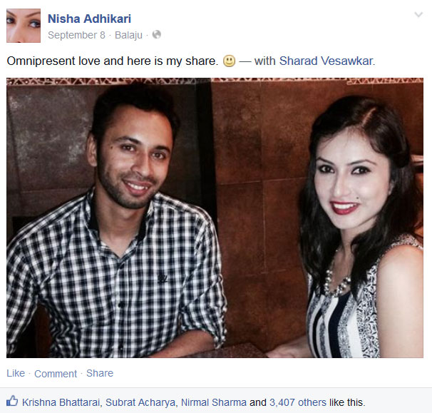 लामो समयको हल्लालाई सत्यमा परिणत गर्दै निशाले क्रिकेटर शरद भेषवाकरलाई प्रेमीको रुपमा चिनाएकी थिइन्। यसअघि उनीहरु गुपचुप प्रेममा रमाइरहेका थिए। जोडीलाई हजारौं फेसबुक प्रयोगकर्ताले बधाई र शुभकामना दिए।