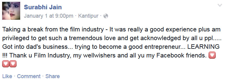 “Taking a break from the film industry – It was really a good experience plus am privileged to get such a tremendous love and get acknowledged by all u ppl….. Got into dad’s business… trying to become a good entrepreneur… LEARNING !!! Thank u Film Industry, my wellwishers and all yu my Facebook friends.”