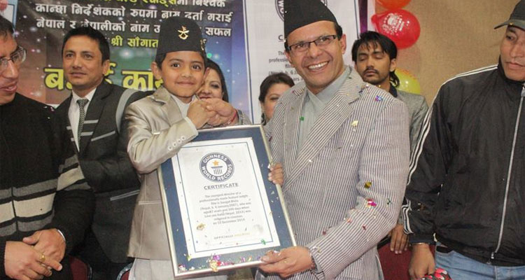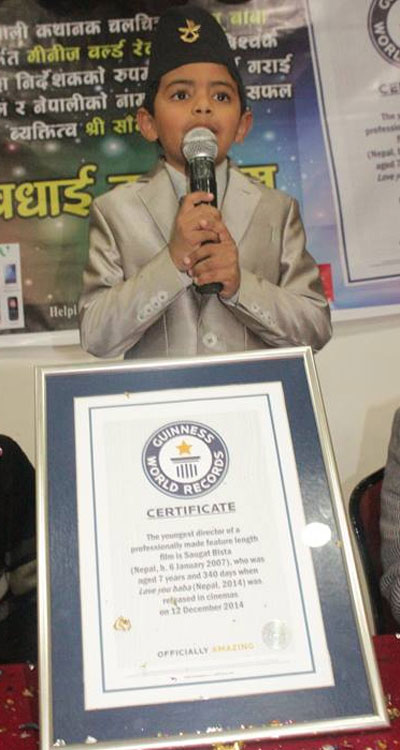 काठमाडौं । फिल्म ‘लभ यु बाबा’का निर्देशक सौगात विष्टले विश्वकै सबैभन्दा कान्छो निर्देशकको रुपमा शुक्रबार गिनिज बुक अफ वल्र्ड रेकर्डसको प्रमाणपत्र पाएका छन् । राजधानीमा आयोजित कार्यक्रममा नेपाल सरकारका प्रवक्ता तथा सूचना तथा सञ्चारमन्त्री डा. मिनेन्द्र रिजालले उनलाई पत्रकार तथा फिल्मकर्मीमाझ गिनिज बुक अफ वल्र्ड रेकर्डसको प्रमाणपत्र प्रदान गरेका हुन् ।