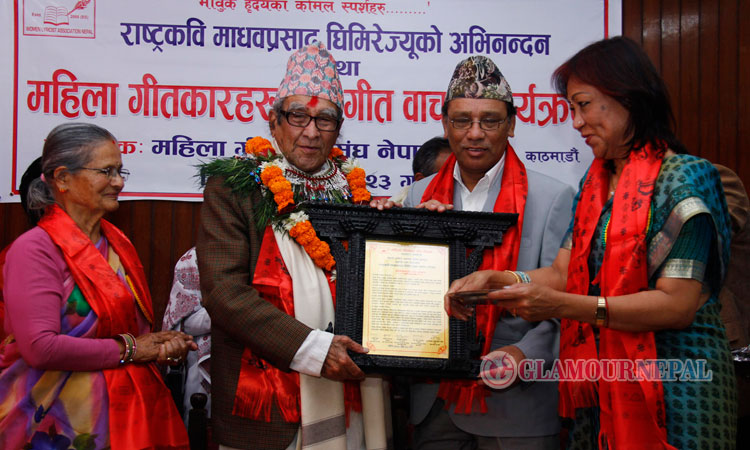 काठमाडौं । महिला गीतकार संघले राष्ट्रकवि माधवप्रसाद घिमिरेलाई राजधानीमा अभिनन्दन गरेको छ । नेपाली सांगीतिक क्षेत्रमा उत्कृष्ट गीतहरु लेखेर योगदान पु¥याएको भन्दै घिमिरेलाई अभिनन्दित भएका हुन् । नेपाल संगीत नाट्य प्रज्ञा प्रतिष्ठानका कुलपति सरुभक्त श्रेष्ठ, उपकुलपति शम्भुजीत बासकोटा, प्रतिष्ठानकी परिषद सदस्य तथा महिला गीतकार संघकी अध्यक्ष उन्नति बोहरा ‘शिला’ले ताम्रापत्र, फुलामाला र दोसल्लाबाट राष्ट्रकवि घिमिरेलाई अभिनन्दन गरेका हु । अभिनन्दतस्वरुप राष्ट्रकविलाई ५० हजार रुपैयाँ पनि प्रदान गरिएको थियो । कार्यक्रममै महिला गीतकारका तर्फबाट नेपाल संगीत नाट्य प्रज्ञा प्रतिष्ठानमा पहिलो पटक परिषद सदस्य भएकोमा अध्यक्ष उन्नती बोहरा ‘शिला’लाई बधाईपत्र दिइएको थियो।