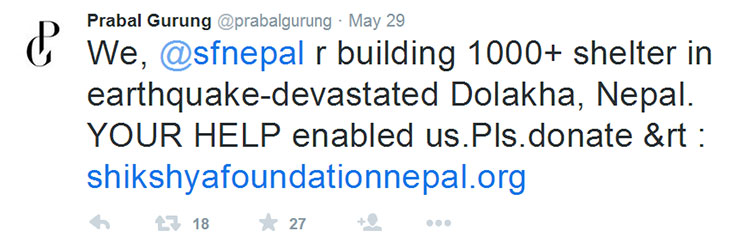 फेशन डिजाइनर प्रवल गुरुङले भुकम्पका कारण घर गुमेका पीडितहरुको लागी घर बनाई दिने घोषणा गरेका छन्। आफ्नो अफिसियल ट्वीटर पेजमा ट्वीट गर्दै उनले दोलखामा १ हजार भन्दा बढी घरहरु बनाउन लागेको बताएका हुन्। उनले नेपालमा विनाशकारी भुकम्प आए लगतै सहयोगको अपिल गरेका थिए। हलिउडका चर्चित स्टारहरुले पनि सहयोग गर्ने इच्छा जाहेर गरेका थिए।
