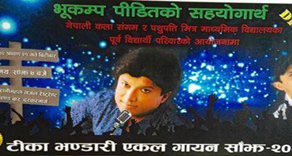 काठमाडौं । चर्चित संगीतकार एवम् गायक टीका भण्डारीले भुकम्प पीडितहरुका लागि बिहीबार राजधानीमा एकल साँझ गर्ने भएका छन् । दरबारमार्गस्थित रानी मलमा गायक भण्डारीले आफ्नो जीवनको पाँचौं एकल साँझ गर्न लागेका हुन् ।