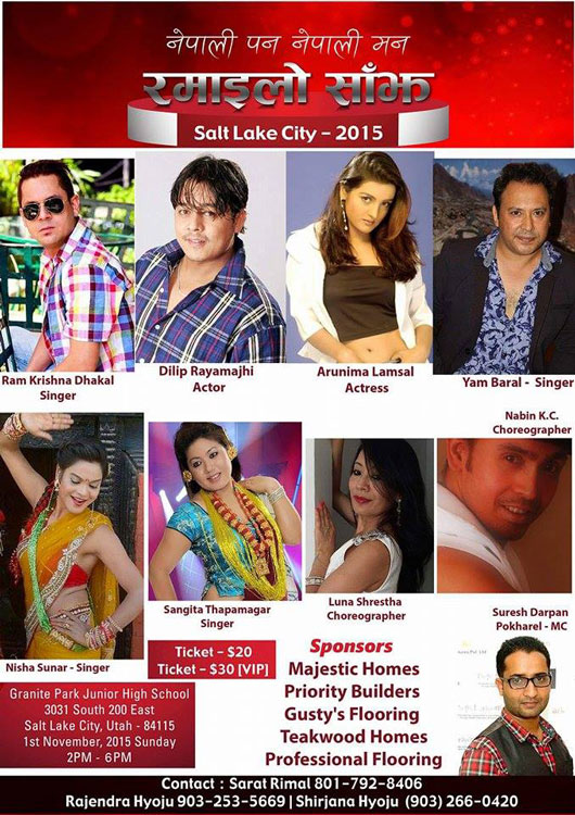 साल्ट लेक सिटीमा पहिलो पटक हुने लागेको नेपाली कार्य्रक्रमलाई सफल बनाउन चर्चित नायक दिलिप रायमझी र नायिका अरुणिमा लम्शालले आकर्षक प्रस्तुतीको तयारी गर्दैछन भने कुनै समय एकअर्काका प्रतिस्प्रर्धी मानिने गायकद्वय रामकृष्ण ढकाल र यम बाराल १४ बर्ष पछी एकै साथ प्रस्तुत हुँदैछन। साथमा गायिका निशा सुनुवार, संगीता थापामगर, नृत्य निर्देशकद्वय नबिन के सि, लुना श्रेष्ठ र फिल्म निर्देशक सुरेस दर्पण पोखरेलको पनि प्रस्तुती रहनेछ।