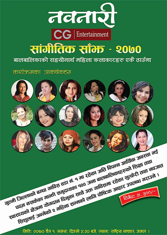 nepali-femail-artistsग्ल्यामर नेपाल, काठमाडौं । लोकप्रिय मासिक पत्रिका नवनारीले सामाजिक सेवामा पनि हात बढाएको छ। नवनारीको प्रकाशन कम्पनी नवनारी मिडिया एण्ड रिसर्च प्रालिले गुल्मीको बम्घा गाबिस वडा न. १ मा रहेका अति विपन्न माझी समुदायका बच्चाहरुको शिक्षामा योगदान पुर्‍याउने उद्येश्यले ‘नवनारी सांगितिक साँझ २०७०’ को आयोजना गर्न लागेको हो। कार्यक्रममा आउदो चैत्र १ गते शनिबार हुँदैछ।