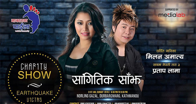 singer Milan Amatyaयसै क्रममा आगामि माघ १७ गते आईतबार दरबारमार्गको नर्लिङ्ग गजलमा मानवताका पाईला नामक अभियानले नुवाकोट छाप गाबिसका भुकम्प पिडितलाई सहयोग गर्न सांगितिक कार्यक्रम आयोजना गर्ने भएको छ । उक्त कार्यक्रममा गायिका मिलन अमात्य र नेपाली तारा ३ प्रताप लामाले आफ्नो प्रस्तुती दिने भएका छन्।